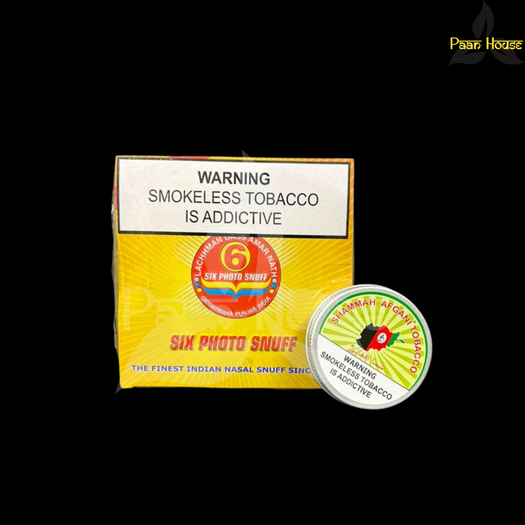Six Photo Snuff (Shammah Afgani Tobacco) is a premium traditional smokeless tobacco, known for its strong potency, rich aroma, and authentic Afgani-style preparation. Made from carefully selected tobacco leaves, this product offers a powerful and satisfying experience for regular users who prefer bold strength.