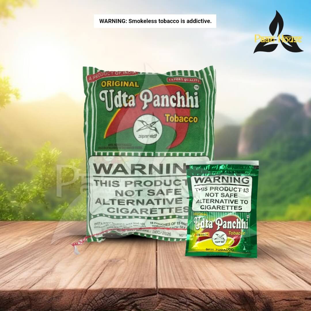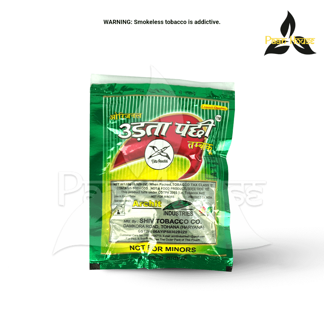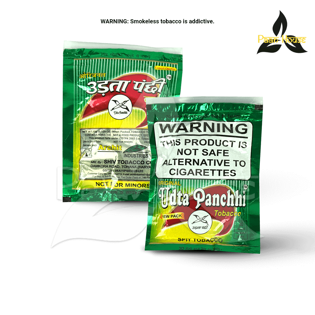Take a pinch of Udta Panchi Khaini and place it between your cheek and gum. Let it release its full flavor and strength. Do not chew or swallow. Spit after use.